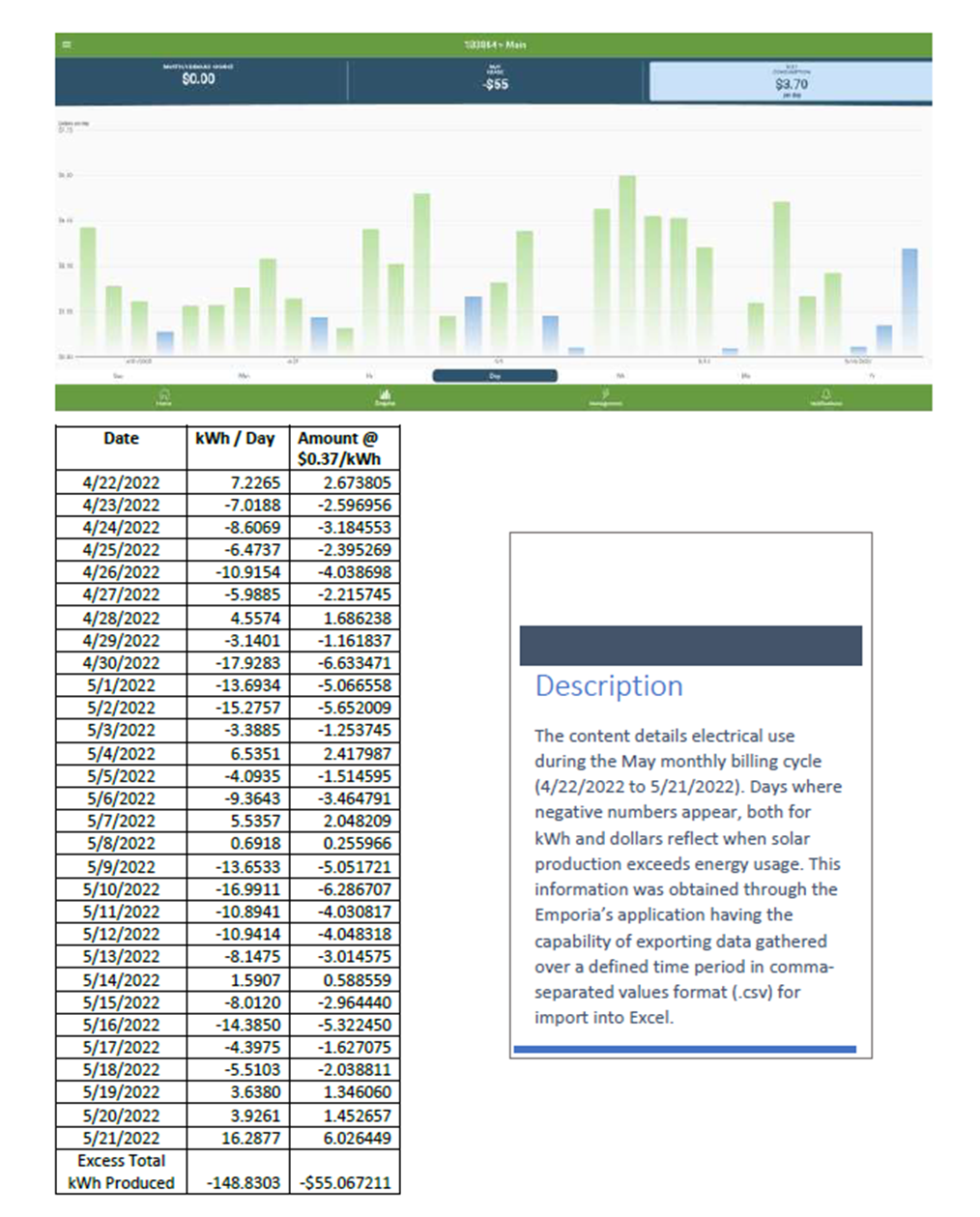 The image below provides useful information the Emporia app collected during my May billing period (April 22nd to May 21st), and demonstrates a wonderful feature of the Emporia app. That is its ability to export data for effective analysis. As shown below, we can view the net results letting us know at the end of each day whether power sent to the grid exceeded power drawn from the grid.